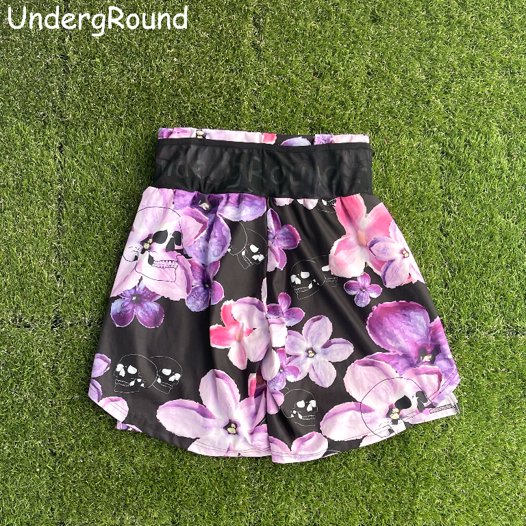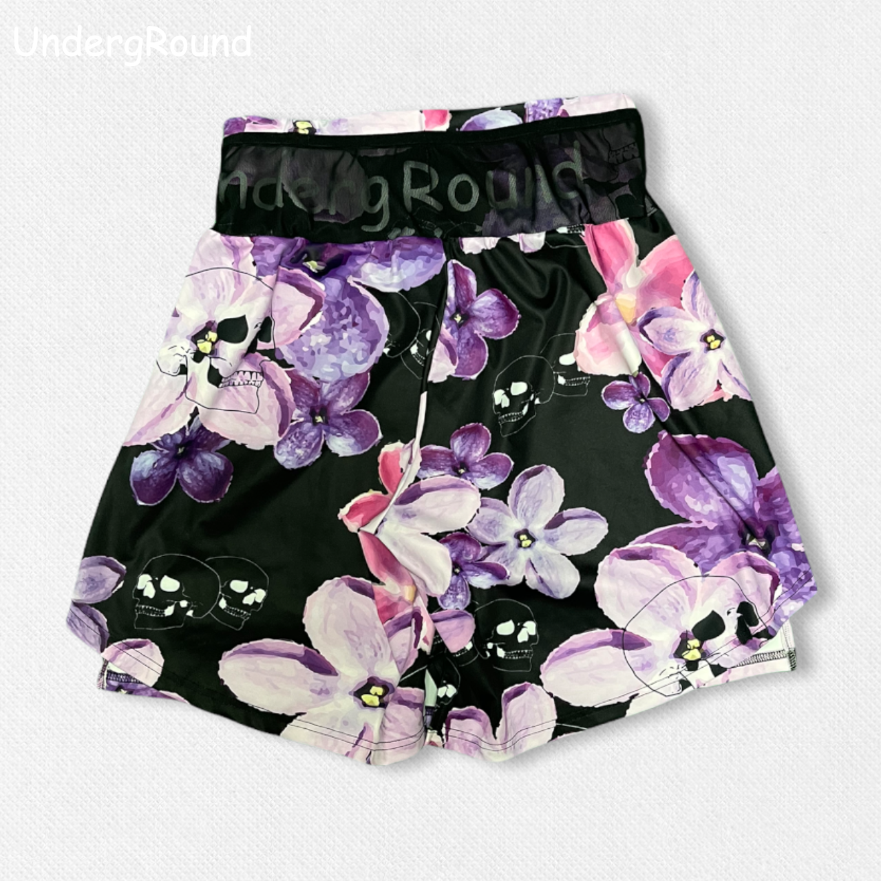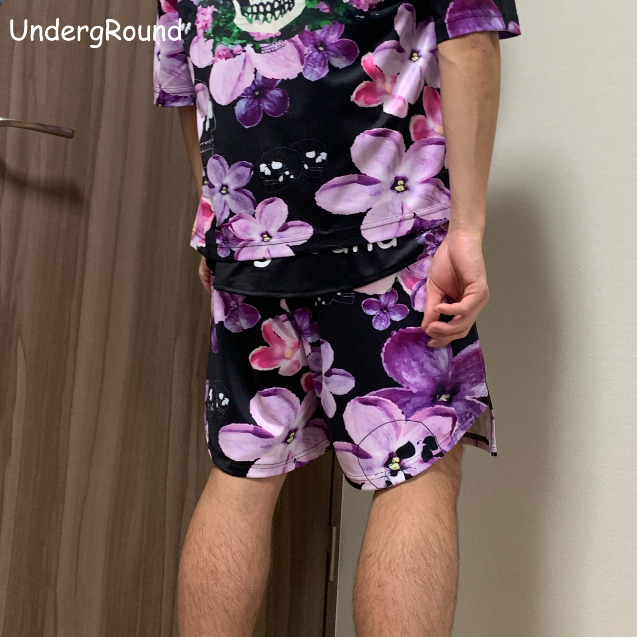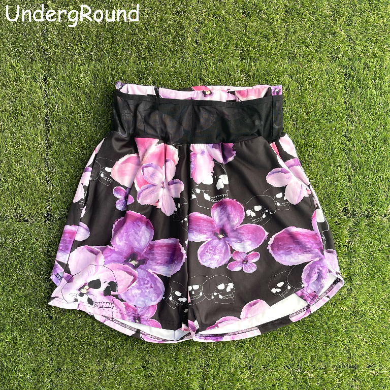 ドクロフローラル柄。ランニングシャツ×ショーツ×アロハシャツでスリーピース。サイズ感にゆとりを持たせたルーズシルエット。腰回りに小ポケットが付いておりランニング中の荷物のブレを軽減します。
