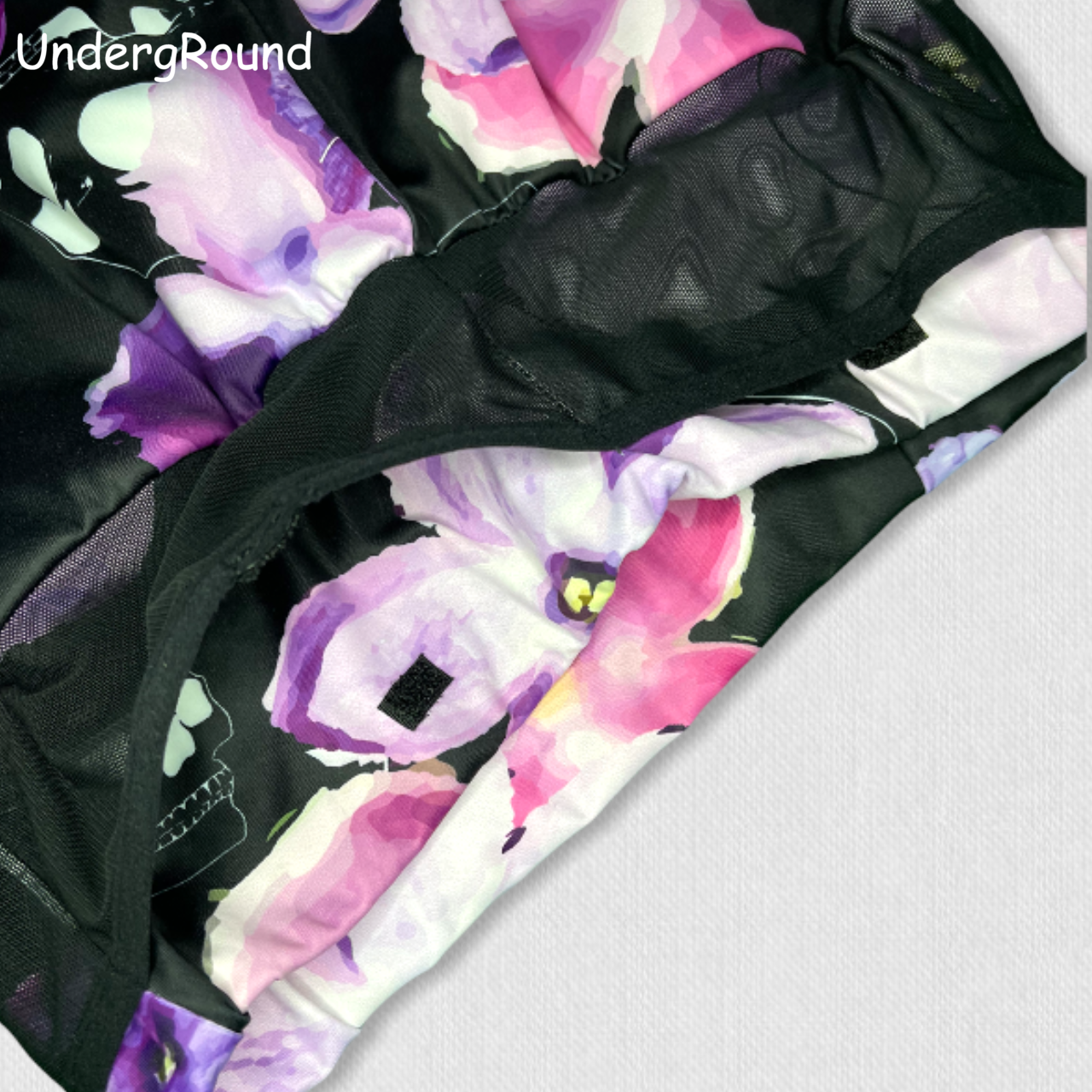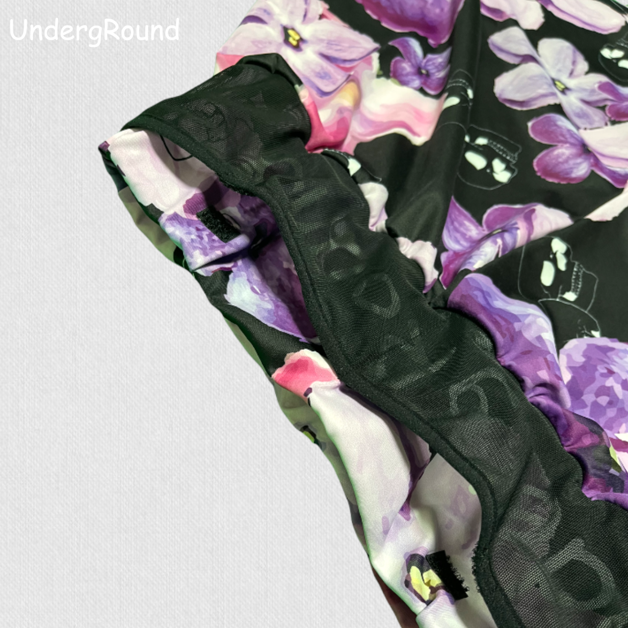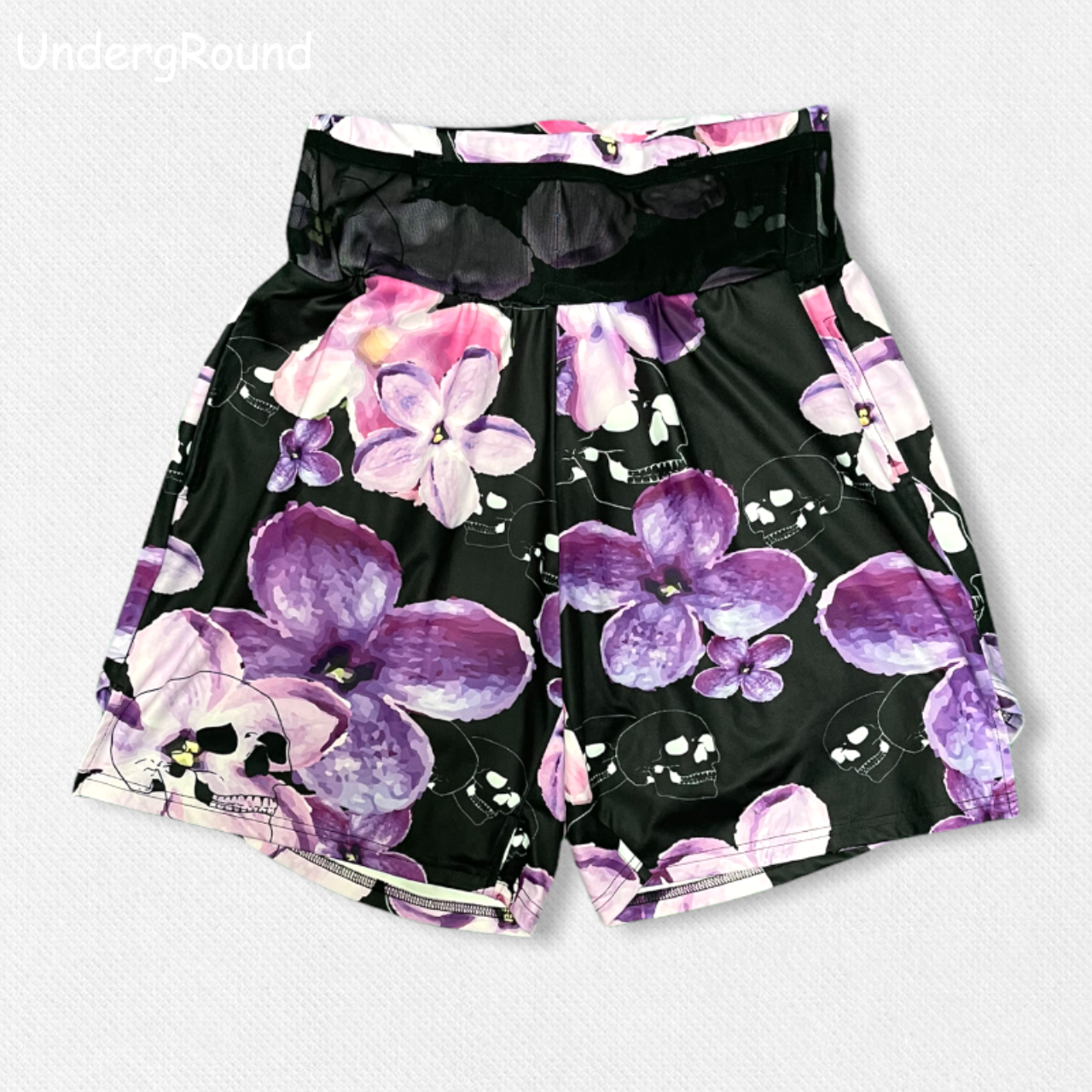 ドクロフローラル柄。ランニングシャツ×ショーツ×アロハシャツでスリーピース。サイズ感にゆとりを持たせたルーズシルエット。腰回りに小ポケットが付いておりランニング中の荷物のブレを軽減します。